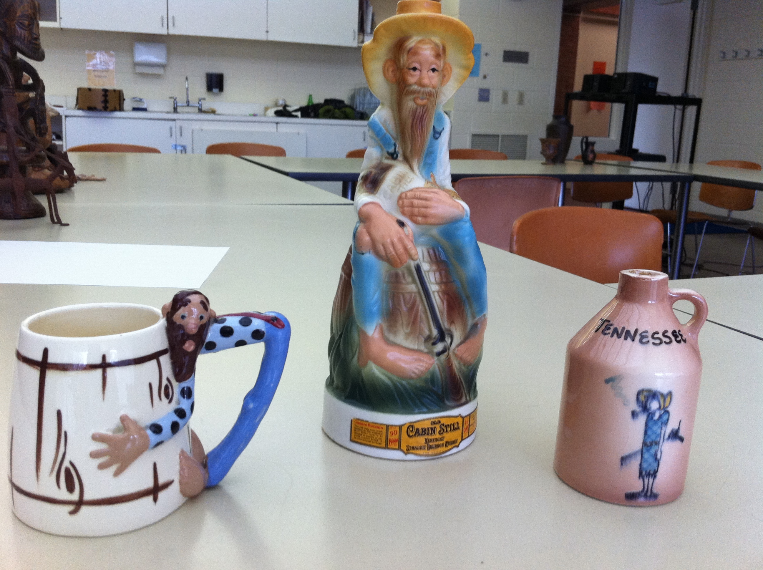 Ceramic items, such as these, often feature stereotypical imagery of Appalachian men as alcoholics or lazy. Photo provided by Chris Miller and Berea College.
