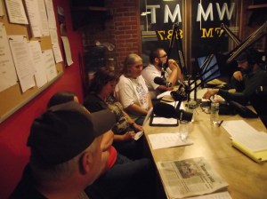 Photo, left, provided by Parker Hobson. Local citizens take to the airwaves at WMMT’s studio to protest school consolidation.